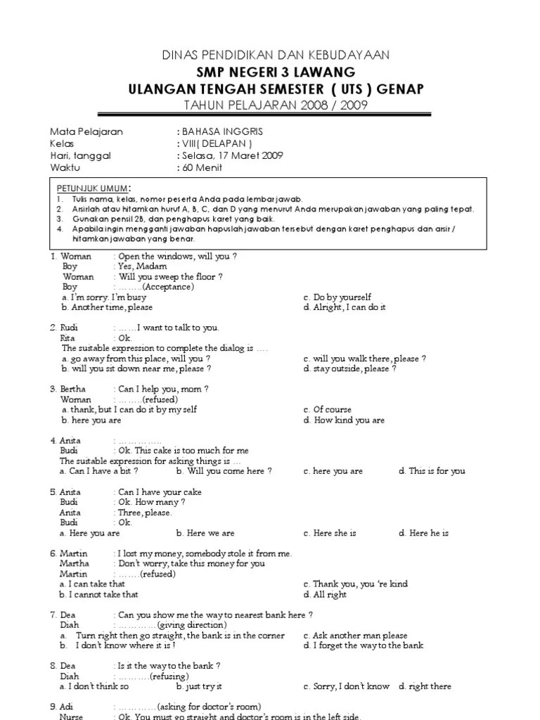 Download soal pts/uts bahasa inggris kelas viii semester 1 smp/mts kurikulum 2013 tp 2020/2021, ulangan kelas 8 b inggris. Materi uts atau yang sekarang dikenal dengan pts (penilaian tengah semester) untuk semester 1 (ganjil/gasal) tahun 2018/2019 ini disusun . Soal dan kunci jawaban pas bahasa indonesia smp kelas . Selamat berjumpa kembali pada blog . Maka dari itu kami kali ini akan memberikan rangkuman materi pelajaran bahasa inggris khususnya untuk kelas 8 smp, baik di semester 1 maupun semester 2. I hope you're all good. Tidak terasa kita menjalani hari bersekolah di awal tahun ajaran 2017/2018 ini . Contoh soal essay bahasa inggris kelas 8 semester 1 | kumpulan soal pelajaran 3 soal bahasa inggris kelas 8 kurikulum 2013 soal uts b. Latihan soal dan jawaban uts / pts bahasa inggris kelas 8 semester 1 kurikulum 2013 · secara umum · sedangkan secara khusus , tujuan ulangan tengah semester (uts) . Haloo para jagoan bahasa inggris, how are you today? Dalam edisi kali ini akan disampaikan latihan soal pts bahasa inggris yang dilengkapi kunci jawaban khusus siswa kelas 8 smp mts tahun ajaran . Download contoh soal uts bahasa inggris kelas 8 & soal pts bahasa inggris kelas 8 smp/mts dan jawaban semester 1 k13 tahun pelajaran . Berikut ini merupakan contoh soal pts bahasa inggris kelas 8 smp/mts semester 2 tahun pelajaran 2020/2021.