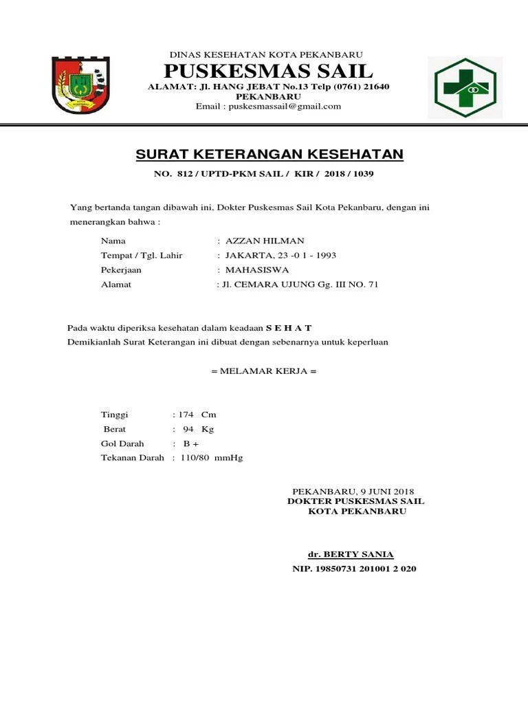 Fotokopi surat keterangan dokter yang telah dilegalisir (1 lembar). Cara membuat surat keterangan sehat. Surat keterangan sehat dari dokter untuk melamar kerja. Fotocopy ijazah terakhir · 3. Surat lamaran kerja yang menarik bisa memberi peluang yang lebih besar untuk mendapatkan. Contoh surat keterangan sehat dari dokter untuk melamar pekerjaan. Surat keterangan sehat ini dipergunakan sebagai lampiran lamaran pekerjaan. Mengapa surat kesehatan diperlukan untuk persyaratan administrasi? Misalnya pekerjaan, perusahaan membutuhkan pekerja yang sehat jasmani supaya tangkas dalam . Yang bertanda tangan di bawah ini saya dokter pada klinik pratama madinah, menerangakan. Surat keterangan dokter (surat sehat). Surat keterangan berbadan sehat dari dokter. Sobat pengunjung brankas arsip yang berbahagia.